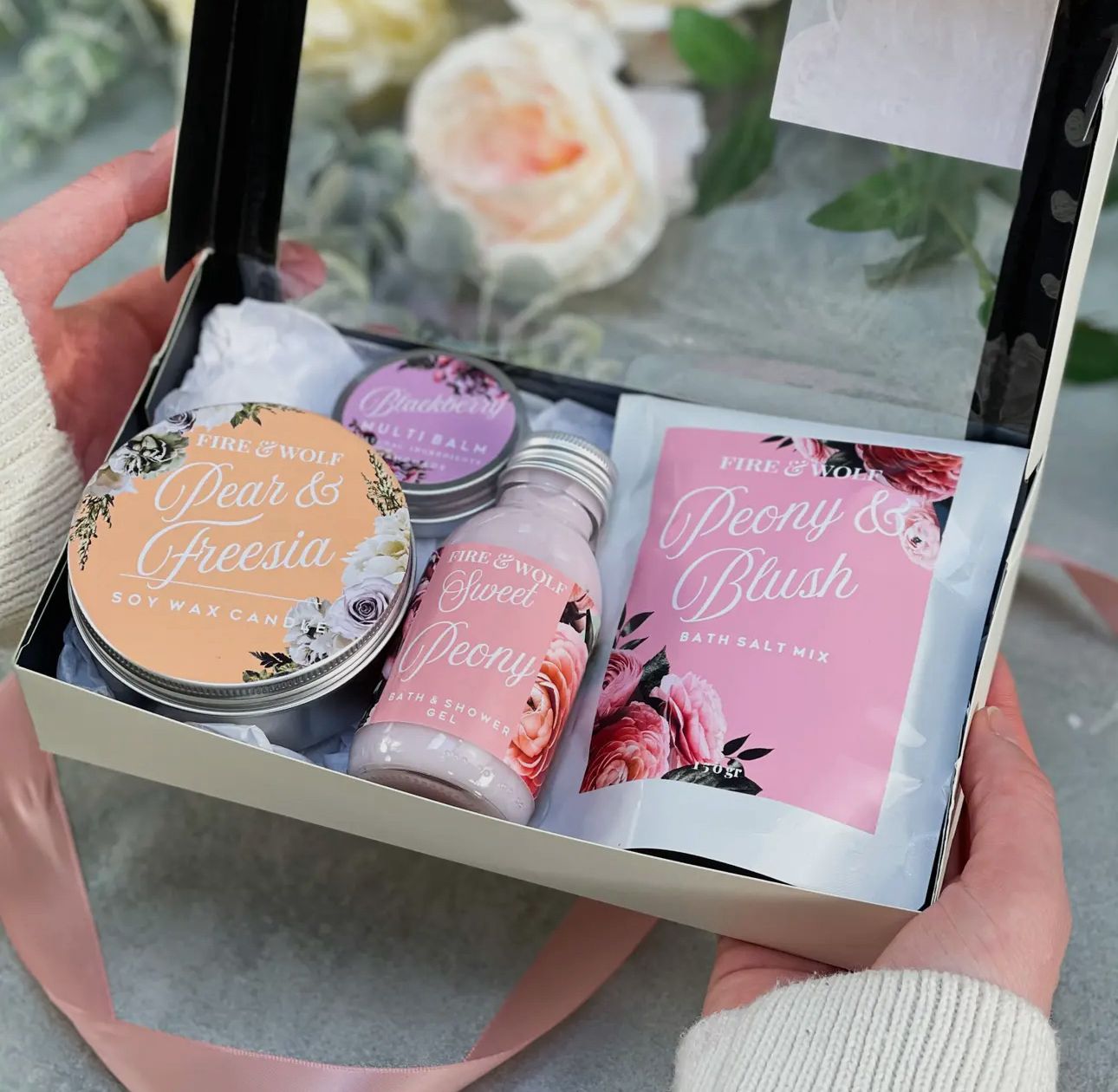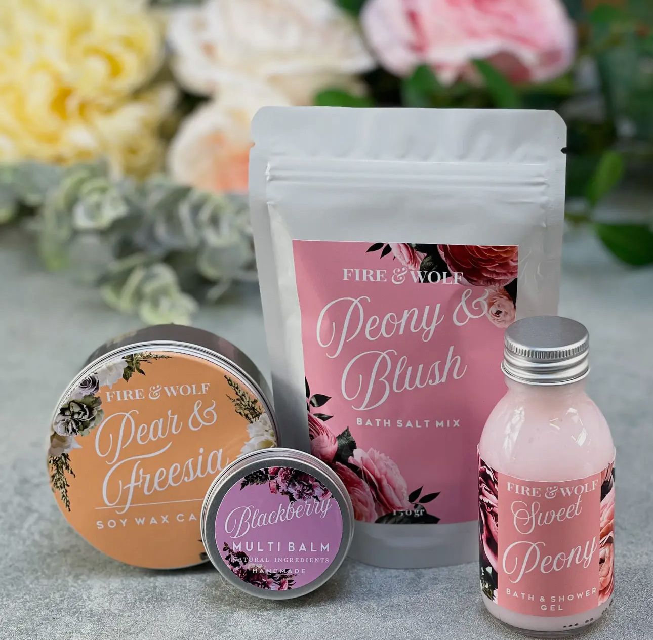 A soy wax candle in a tin, scented with Pear and Freesia, to fill the room with beautiful aroma while you relax. Bath salts scented with the deep velvety scent of Peony blush for you to lay back and soak away the stresses of the day. A natural multi balm with Blackberry scent which is perfect for keeping hands, face and lips moisturised and a bottle of stunning shower cream.