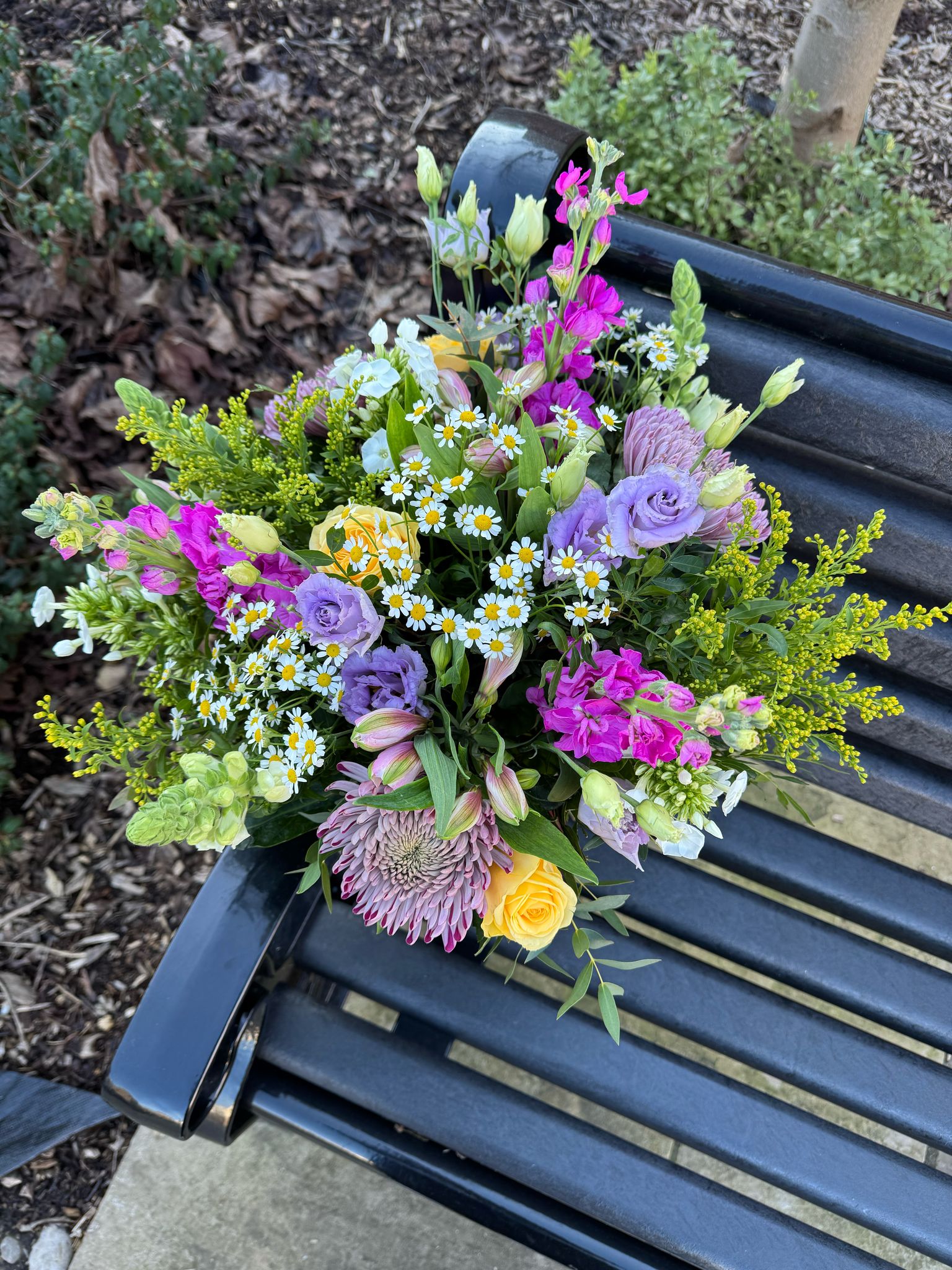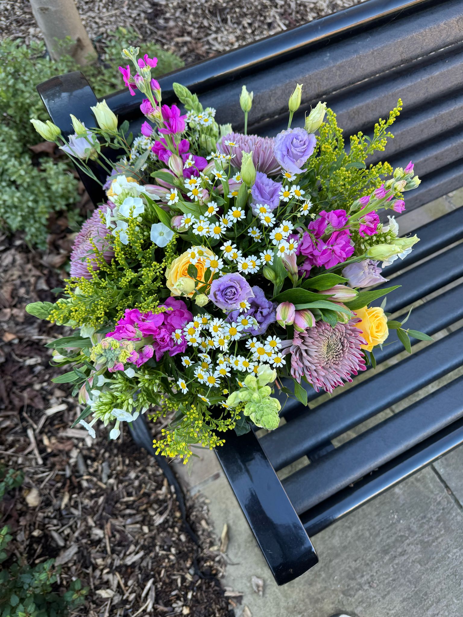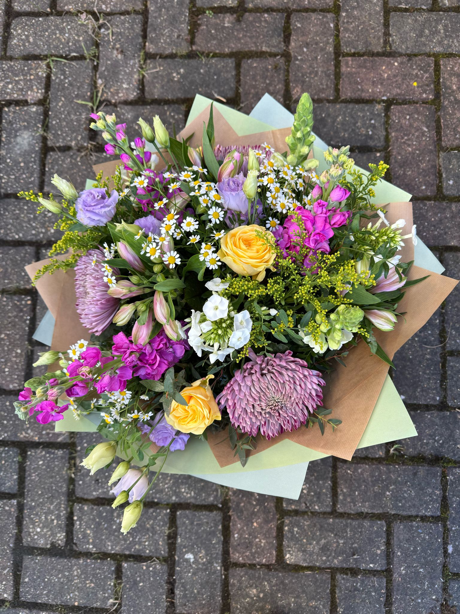The bouquet includes a variety of flowers in pastel shades of purple, pink, yellow, and white, along with lush green foliage. The bouquet is artfully arranged with a mix of textures and colors, creating a pretty and elegant display. Wrapped up in a pretty paper and gift box for ultimate freshness.